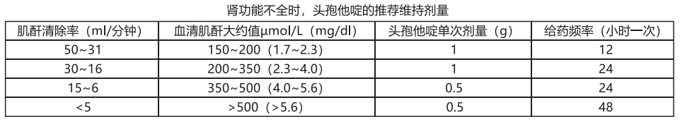對(duì)于嚴(yán)重感染的病人,特別是中性粒細(xì)胞減少癥的患者,一般每天接受6g的頭孢他啶的劑量,但不能用于腎功能不全的病人.以上表格所列的單次劑量可以增加50%或適當(dāng)增加給藥頻率。對(duì)這些病人,建議監(jiān)測(cè)頭抱他臉的血清濃度,而谷濃度