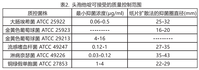 質(zhì)量控制標(biāo)準(zhǔn)化藥敏試驗(yàn)方法需采用實(shí)驗(yàn)室對(duì)照品,以便監(jiān)測(cè)和確保藥敏試驗(yàn)中所用樣品和試劑以及試驗(yàn)操作人員技術(shù)的準(zhǔn)確度和精確度.頭袍他碇標(biāo)準(zhǔn)粉末應(yīng)提供表2中的MIC值范圍.對(duì)于使用30Pg頭孢他啶紙片進(jìn)行的擴(kuò)散法應(yīng)符合表2中的標(biāo)準(zhǔn).
